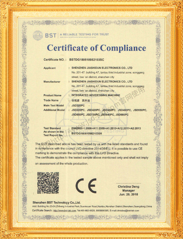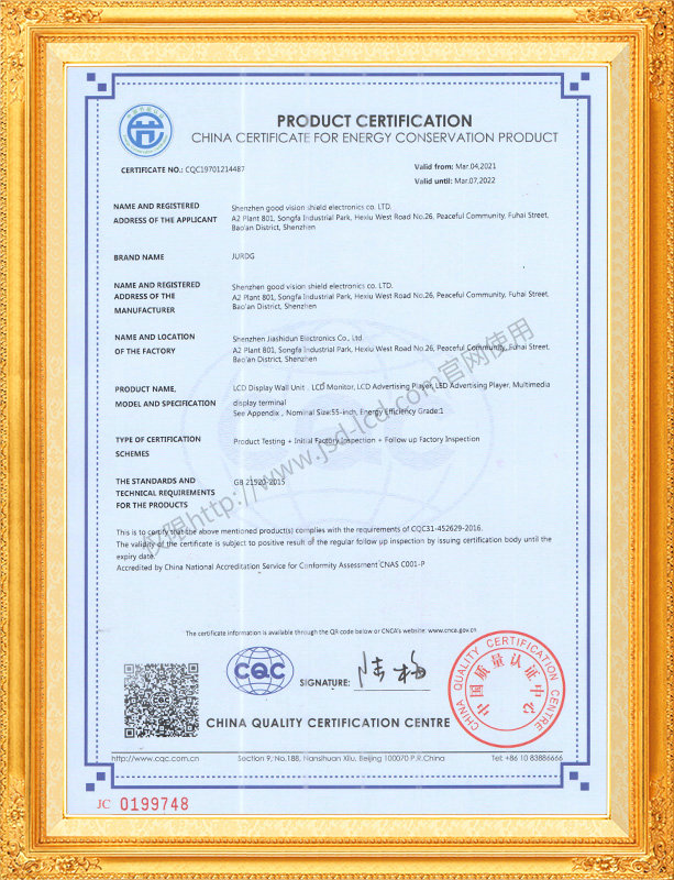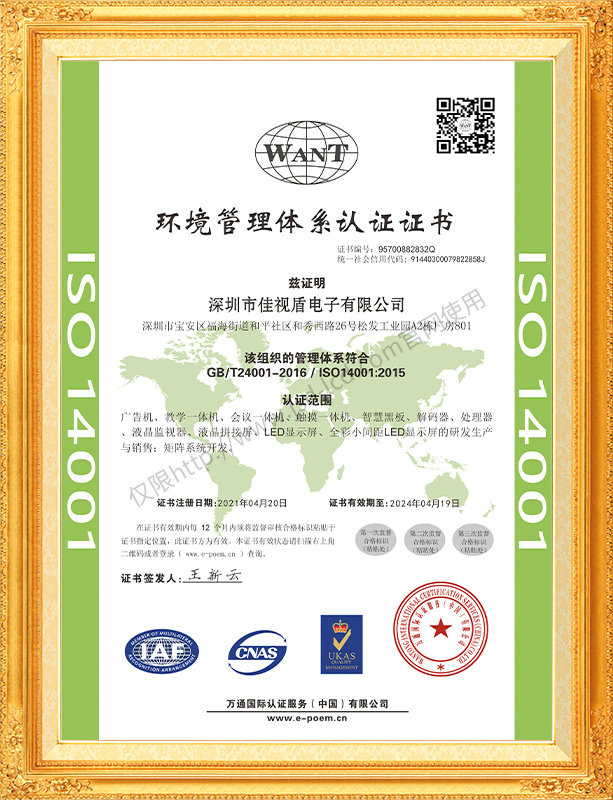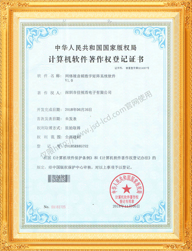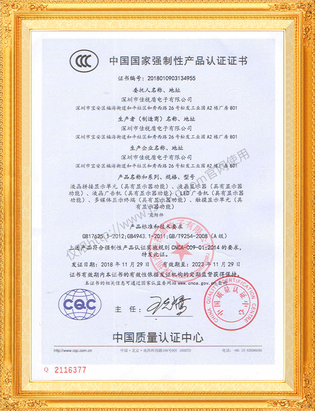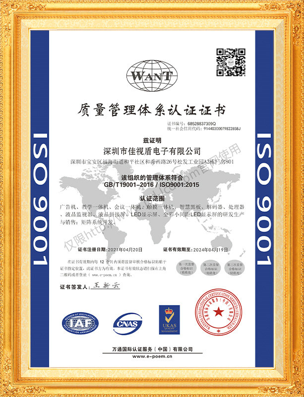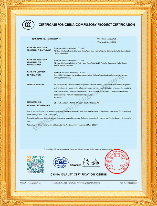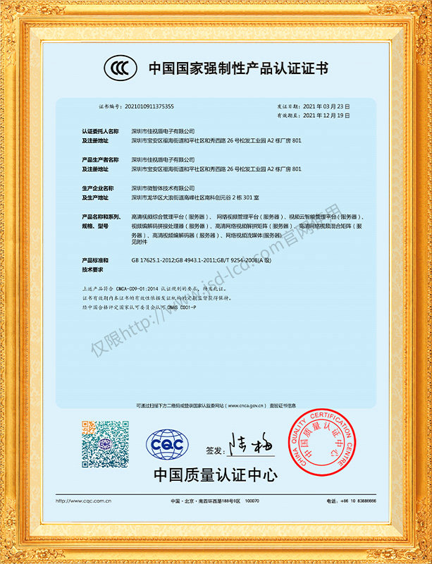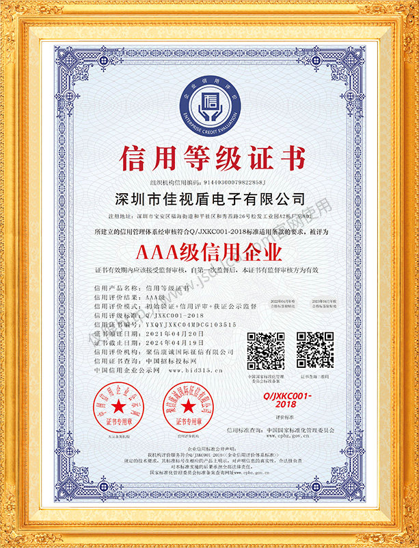 佳視盾科技采用了科學現(xiàn)代化管理模式,公司和產(chǎn)品通過了CCC、CB、CE、FCC、ROHS、ISO9001、職業(yè)健康管理體系、環(huán)境管理體系,中國節(jié)能認證、多項認證,取得多項專利技術及多項軟件著作權, 并獲得國家及行業(yè)協(xié)會的多項榮譽證書,所有產(chǎn)品均經(jīng)過嚴格老化檢測及測試,達到行業(yè)優(yōu)等品的出貨標準。